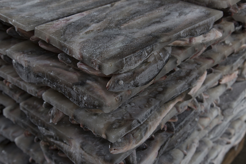 当社は製造部門を担うグループ会社・渡島冷蔵株式会社の設備と機能を活用し、近海産の真ホッケを中心に、加工原料用凍魚の生産を行っています。加工用原料凍魚としてはホッケ以外にサバ・イワシ・フグ・スルメイカなどを扱うほか、水産餌料向けにはイワシ・サバ・カジカなども凍魚として生産しています。